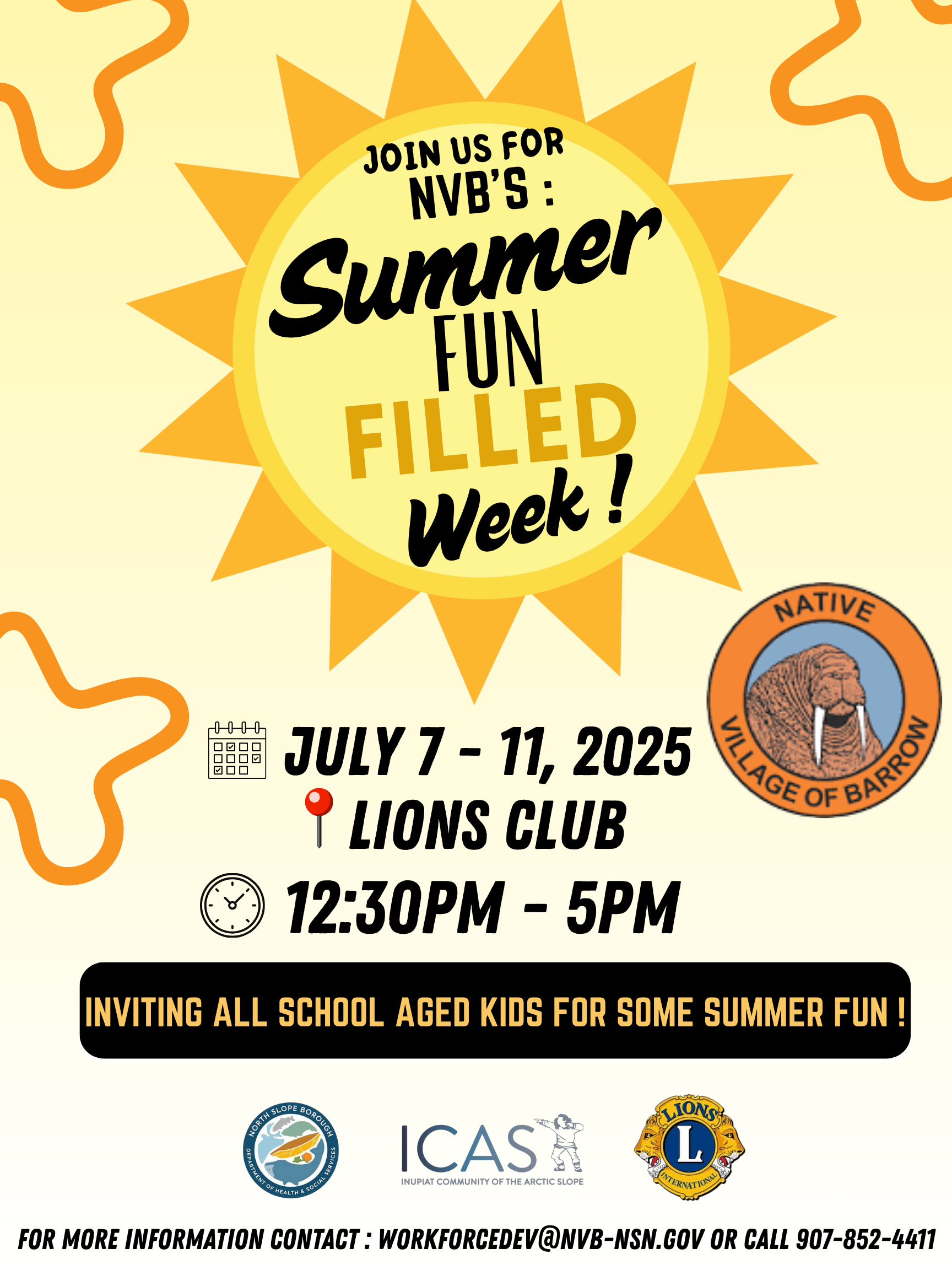 Join us for NSB's Summer Filler Fun Week! July 7-11, 2025 Lions Club 12:30P- 5:00PM Inviting all school aged kids for some summer fun! For more information contact Workforcedev@nvb-nsn.gov or call (907)852-4411...