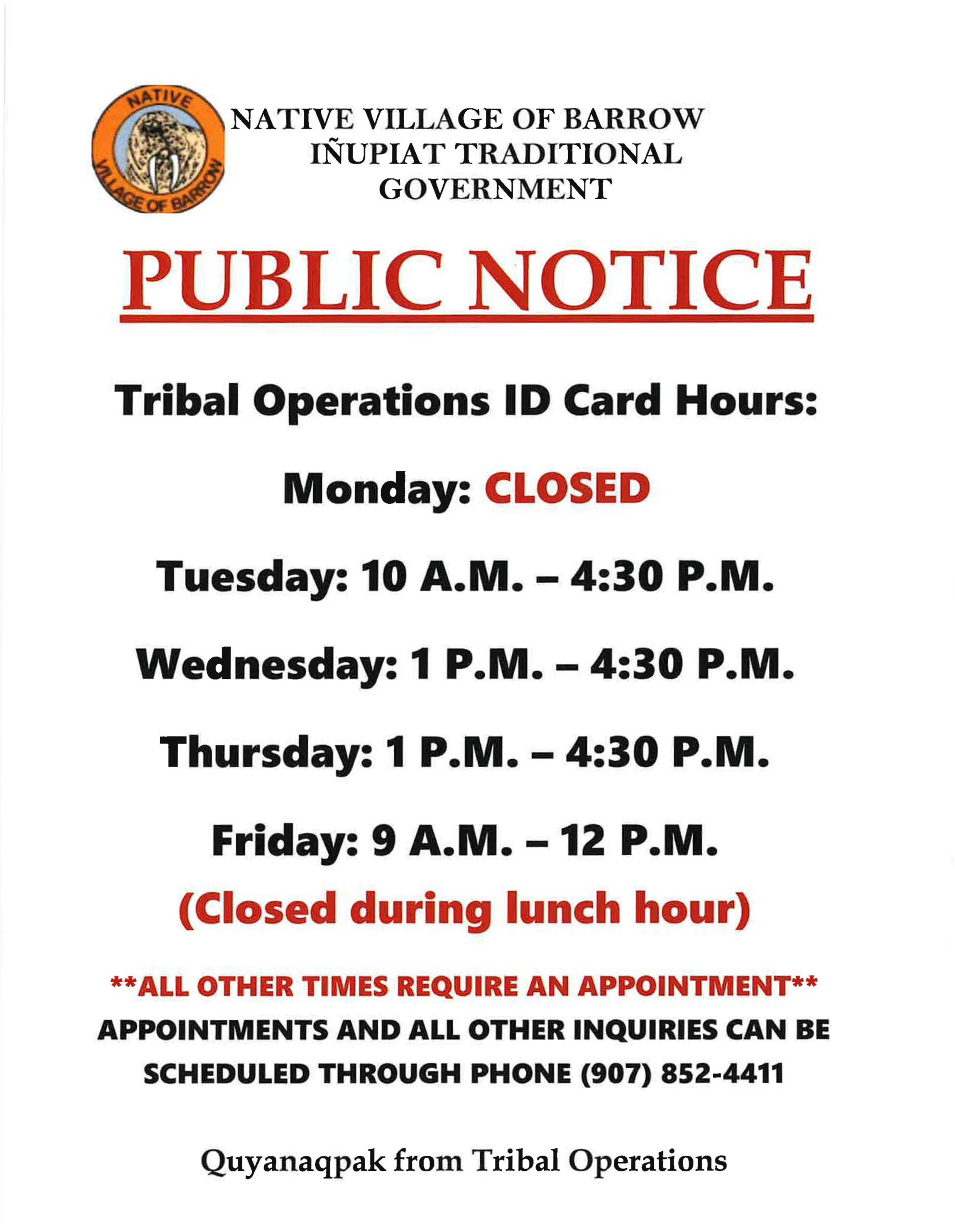 Tribal Operations ID Card Hours Monday: **Closed** Tuesday: 10:00AM-4:30PM Wednesday: 1:00PM-4:30PM Thursday: 1:00PM-4:30PM Friday: 9:00AM-12:00PM (Closed during lunch hour) **All other times require an appointment**...